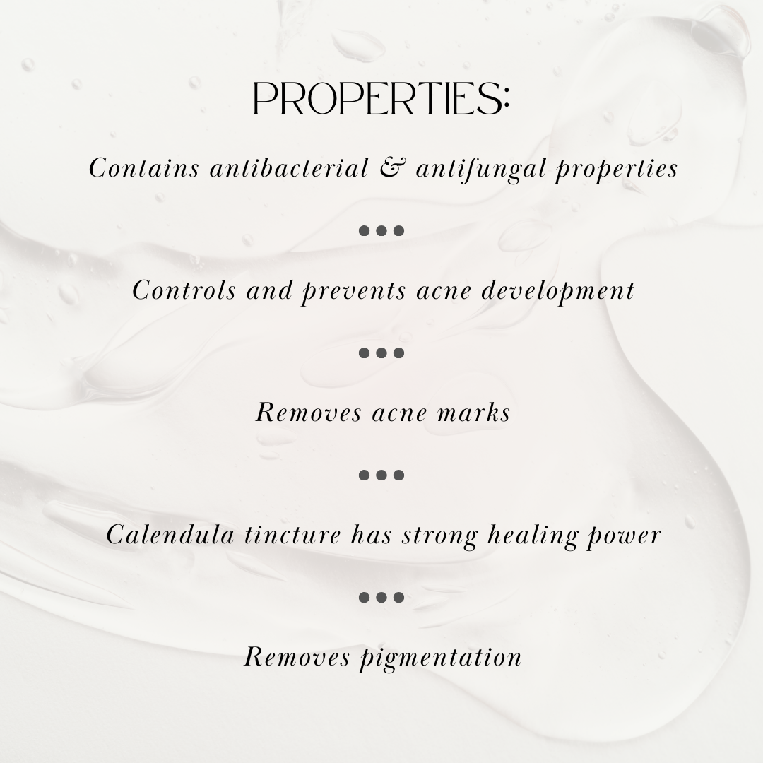 Calendula Tincture (derived from fresh or dried calendula flowers): A concentrated herbal extract known for its anti-inflammatory, wound-healing, and skin-soothing properties used to treat irritations, acne, wounds, and sensitive skin conditions.
